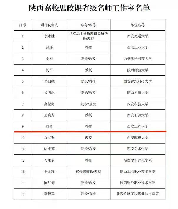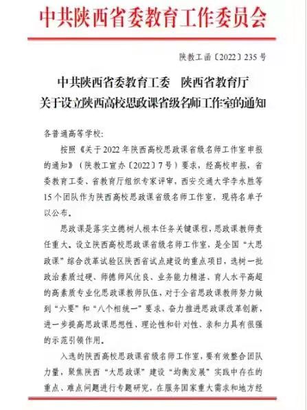近日,中共陕西省委教育工委、陕西省教育厅下发《关于设立陕西高校思政课省级名师工作室的通知》,全省共有15个团队入选陕西高校思政课省级名师工作室,2026年国际足联世界杯曹敏教授团队成功入选。