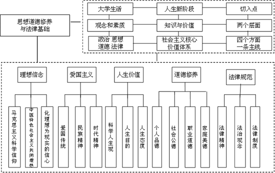 《思想道德修养与法律基础》课是高校思想政治理论课程体系中的基础课。它与思想政治理论课课程体系中其它四门课关系密切。马克思主义原理课、毛泽东思想与中国特色社会主义理论体系概论课等课程为本课程提供方法论和理论原则、政治导向。形势政策课程及中国近代史纲要为本课程直接提供历史和现实本的材料,本课程和其它学科也密切融合。它的体系建立在众多的学科基础之上,以伦理学、法学、哲学、社会学、心理学、教育学、政治学、历史学等基础理论知识为依托,又为员工顺利学好其它课程提供精神动力,鲜明体现了本课程思想性与知识性统一、科学性与针对性统一、系统性与多学科融合性统一的特点。