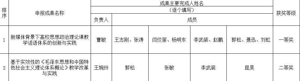 在2017年校级教学成果奖申报评选中,曹敏教授为第一完成人申报的“新媒体背景下高校思想政治理论课教学话语体系的创新与实践”成果获得一等奖;王婉玲教授主持完成的“基于实效性的《毛泽东思想和中国特色社会主义理论体系概论》教学改革与实践”成果获二等奖。