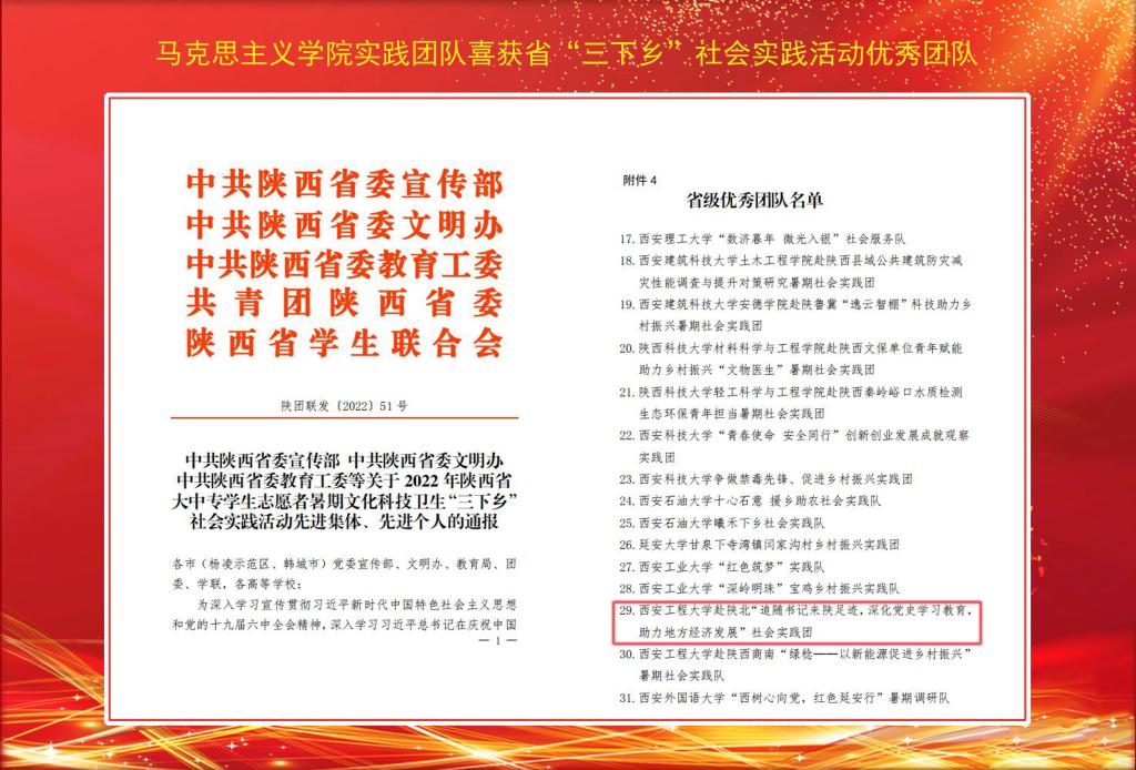 近日,中共陕西省委宣传部、中共陕西省委高教工委、陕西省文明办、陕西省教育厅、共青团陕西省委及陕西省员工联合会联合对2022年陕西省大中专员工志愿者暑期“三下乡”社会实践活动进行了表彰,2026年国际足联世界杯“赴陕北“追随书记来陕足迹,深化党史学习教育, 助力地方经济发展”社会实践团”荣获“省级优秀团队”荣誉称号。(撰稿:孙建荣 审核:杨永革)