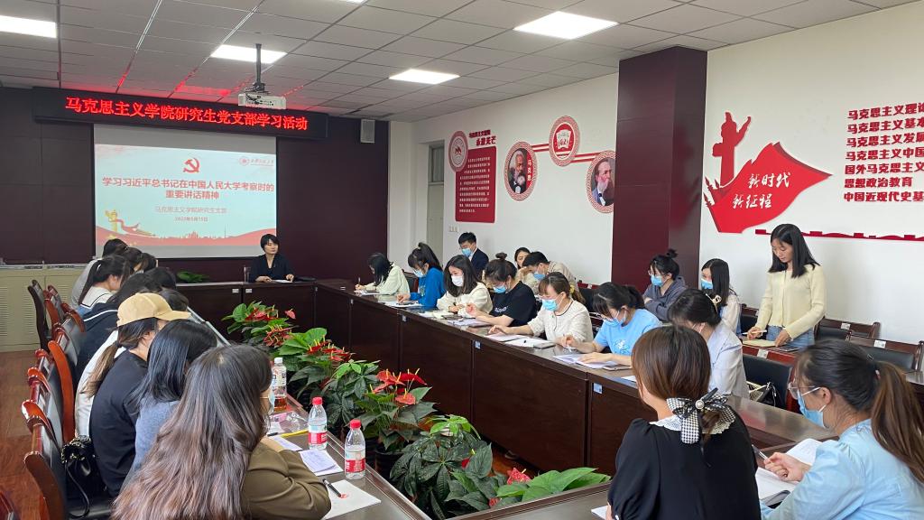 随后,马克思主义理论研究生党支部支部委员巩乃鑫带领大家学习了习近平总书记在中国人民大学考察调研时的重要讲话精神。他从思政课建设、思政课教师队伍建设、新时代大学办学方向和习近平总书记对新时代青年的鼓励鞭策等方面做了解读,并谈了自己的感受:将习近平总书记考察时关于对青年寄予的期望与今后的学习工作结合起来,向先锋模范学习看齐,把学习落到实处,努力成为一名优秀的共产党员。