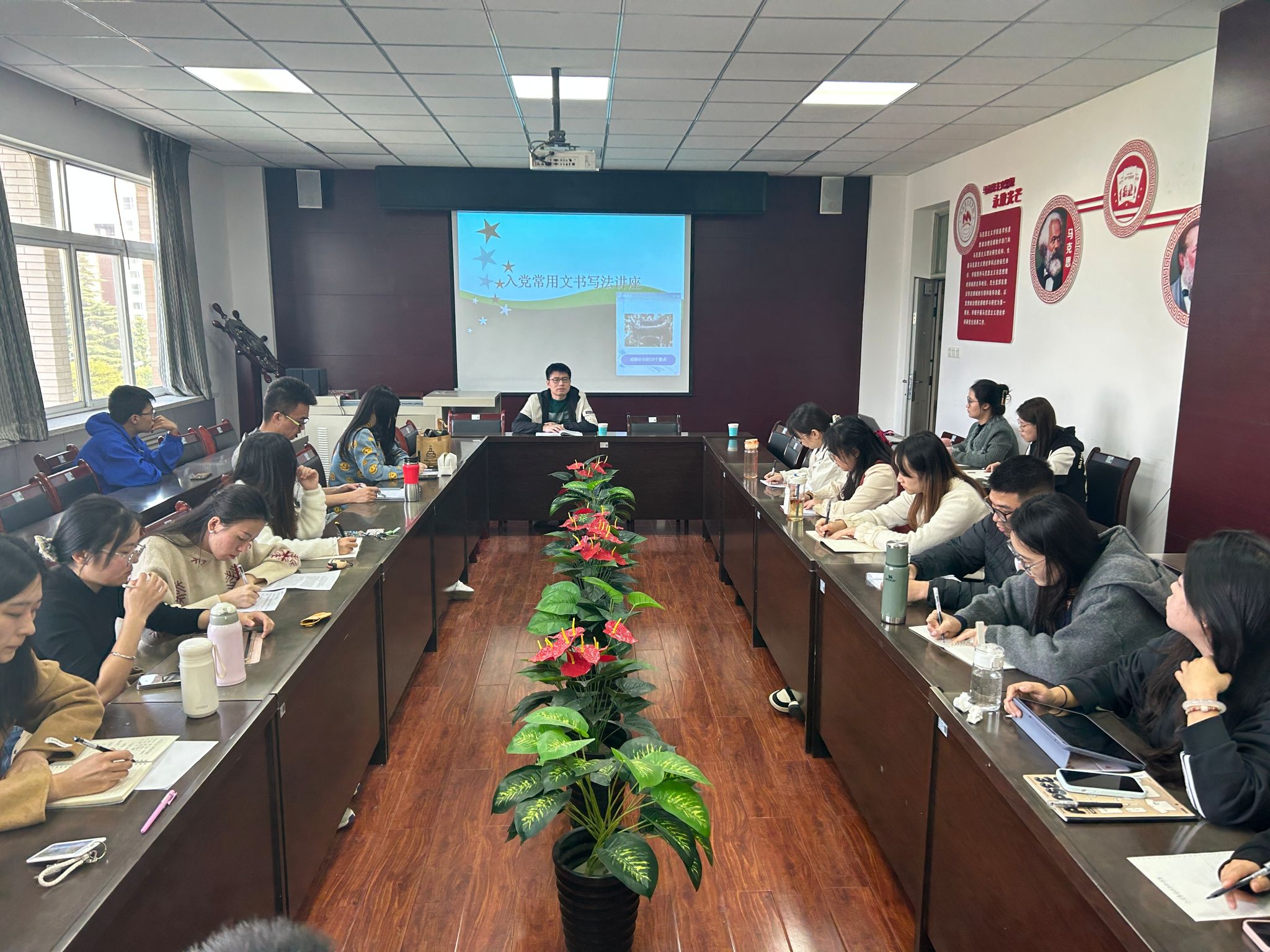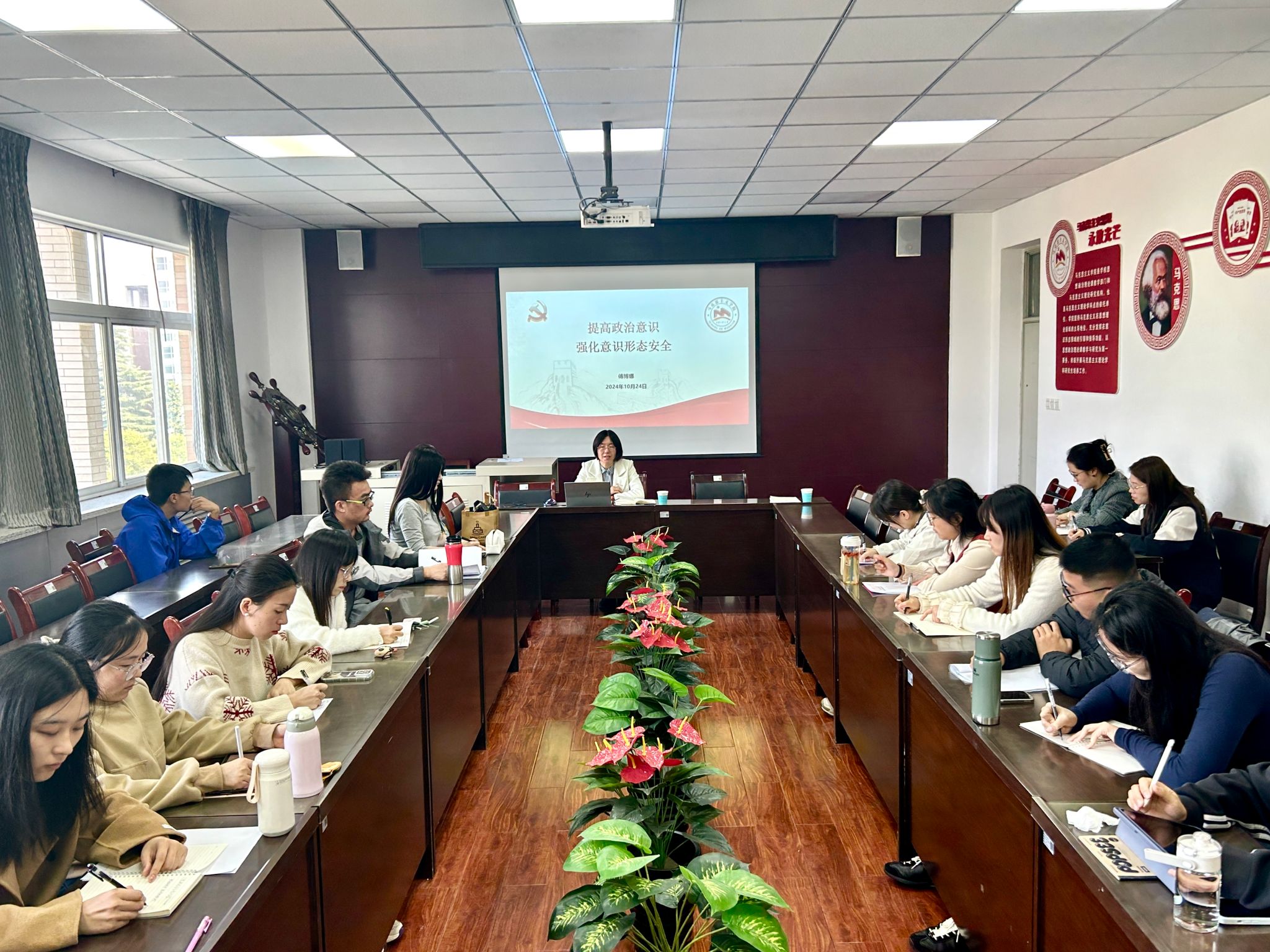 随后,傅博娜以《提高政治意识,强化意识形态安全》为主题讲授了党课。她分别从习近平总书记关于意识形态的重要论述、高校意识形态工作面临的形势挑战以及如何提高网络安全意识、加强校园文化建设这四个方面进行了详尽阐述。她强调,作为马克思主义理论专业的研究生,首先要从思想上入党,端正入党动机,认真学习党的二十届三中全会精神,其次要守好意识形态阵地安全,意识形态工作在党的工作中占据至关重要的地位,关乎旗帜、道路和国家政治安全。在当前复杂的社会环境下,高校作为思想文化的关键阵地,务必高度重视意识形态工作,持续提升自己的政治意识与思想认知。傅书记的讲解深入浅出,引经据典,让大家对如何守好意识形态这道防线有了更为深刻的理解。大家对于意识形态阵地的重要性有了更加清晰的认知,也更加坚定了以实际行动争取早日加入党组织的信念。