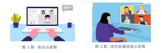 笔记本电脑(第一机位)从正面拍摄,放置在距离本人30cm左右处,手机或笔记本电脑(第二机位)从考生侧后方45°距离本人30cm左右处拍摄,确保第一机位和第二机位分别从考生面前和身后完整拍摄到考生全身、面试小组能够从第二机位清晰看到第一机位屏幕。效果图如下。