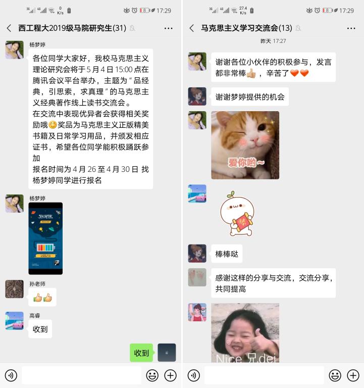 2020年5月4日下午15点,公司副经理郭松、郭沙老师和孙建荣老师及十五名研究生参加了首届线上研究生学术论坛之“品读马列经典,坚定理想信念”读书分享活动,活动在腾讯会议平台顺利举办。