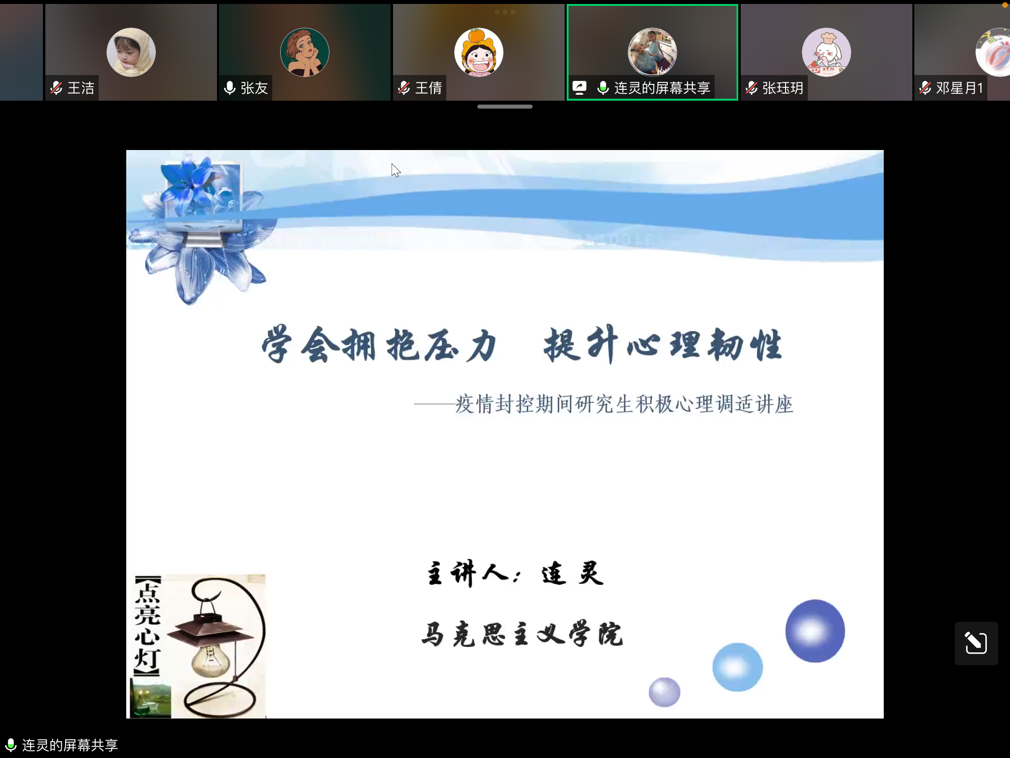 连灵从多个角度,深层次地分析了疫情期间员工中存在的各种心理问题:一是面对疫情,感知员工的压力反应;二是分析压力,疫情下压力成因的心理学解读;三是拥抱压力,提升员工的心理韧性;四是应对压力,员工的个人行动计划。整场讲座是一个互动的平台,同学们积极发言,提出疑问。连灵就同学们普遍关注的问题进行了分析和讲解,提出很多科学合理的、行之有效的应对建议,引导大家关注积极心态的养成,增强心理保健意识。