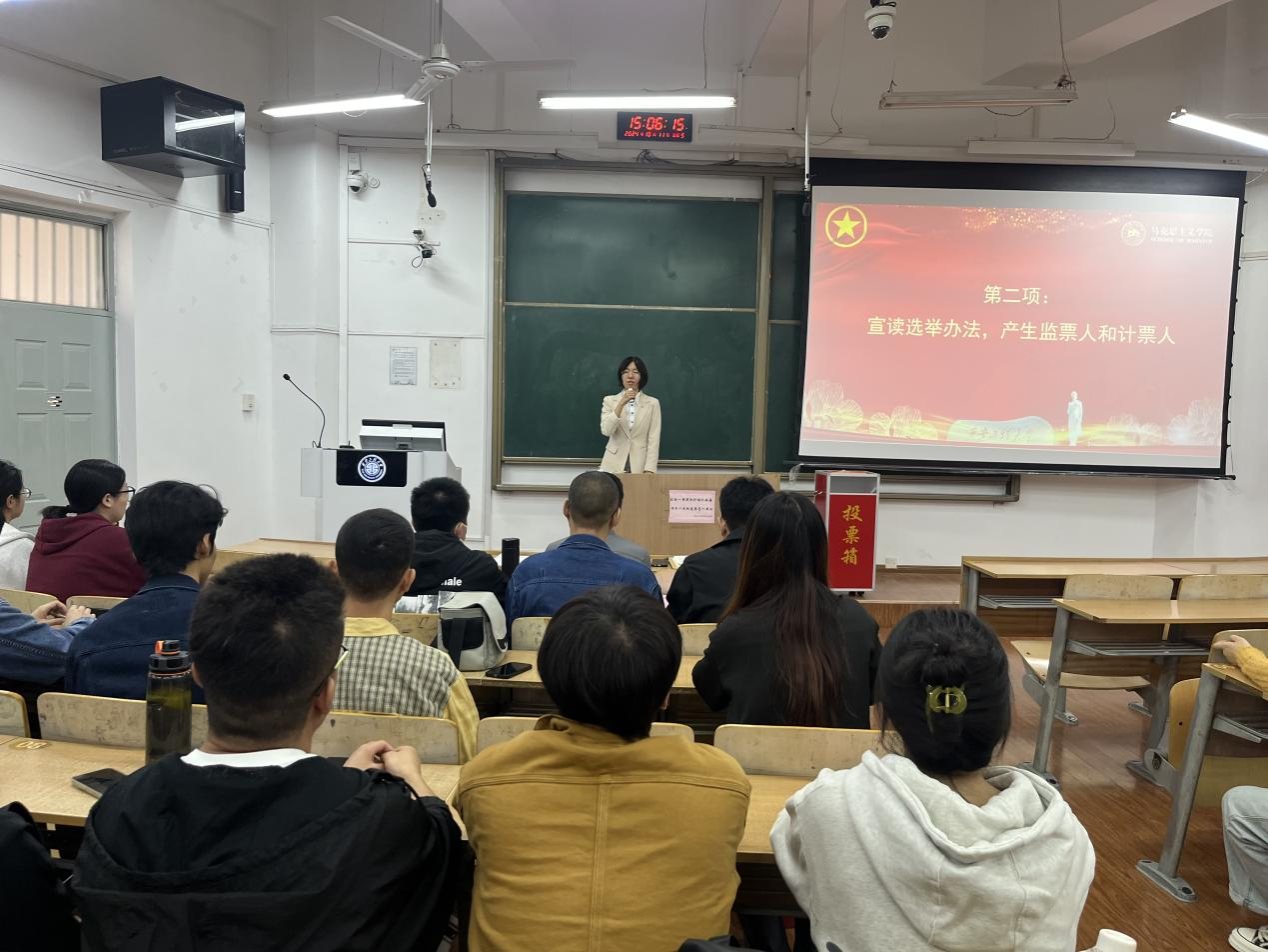 大会在庄严的国歌声中拉开了序幕。傅博娜老师宣读了大会选举办法,介绍了选举工作相关情况及候选人基本情况,通过了大会选举监票人和计票人。随后,大会按照选举办法,经过清点到会人数、发放选票、无记名投票、计票等程序,成功选举出李斌等四人校团代会代表、乔秀洁等三人校研代会代表。大会圆满完成各项议程后,在中国共产主义青年团团歌中落下帷幕。