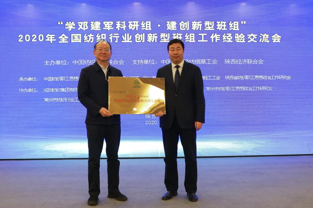 2020年11月12日,2020年陕西省纺织行业争创“赵梦桃小组式先进班组”和“梦桃式最美奋斗者”学习推介工作交流会、“学邓建军科研组·建创新型班组”2020年全国纺织行业创新型班组工作经验交流会在西安举行。中国纺织工业联合会党委书记兼秘书长高勇为公司“梦桃精神 代代相传”全国纺织思想政治教育研究基地授牌,副董事长殷永建代表公司接受基地铭牌。