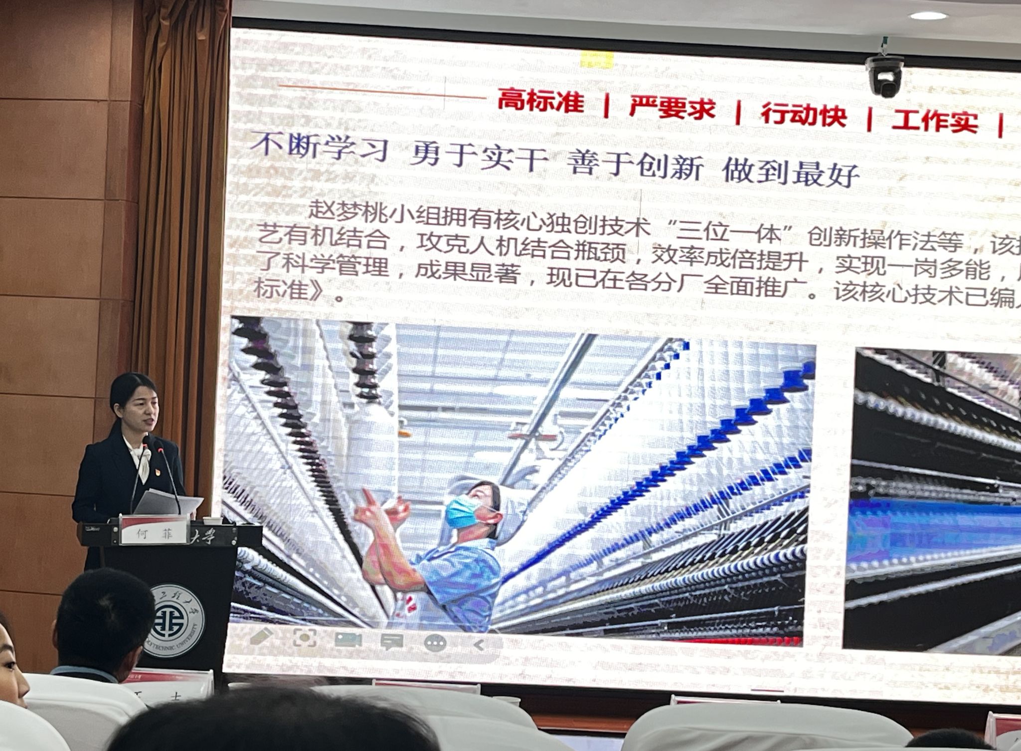 签约挂牌结束后,公司举办“劳模工匠进校园”劳模大讲堂报告会。报告会邀请了全国劳模、赵梦桃小组第九任组长、原西北一棉实业有限公司党办主任徐保凤,全国劳模、赵梦桃小组第十三任组长、咸阳纺织集团党委工作部副部长何菲,全国劳模、五环集团生产技术处操作技术管理员黄云娜分别以“‘梦桃精神’永恒的丰碑”、“弘扬‘梦桃精神’争做新时代最美奋斗者”和“扎根一线守初心,恪尽职守为匠心”为题做了报告。三位劳模用质朴的语言、生动的事例和真挚的情感,讲述了赵梦桃同志短暂而辉煌的一生,讲述了各自在平凡的岗位上扎根基层,一步一个脚印,苦练操作基本功,在工作中勇挑重担的精神,让现场的师生深受鼓舞和感动。