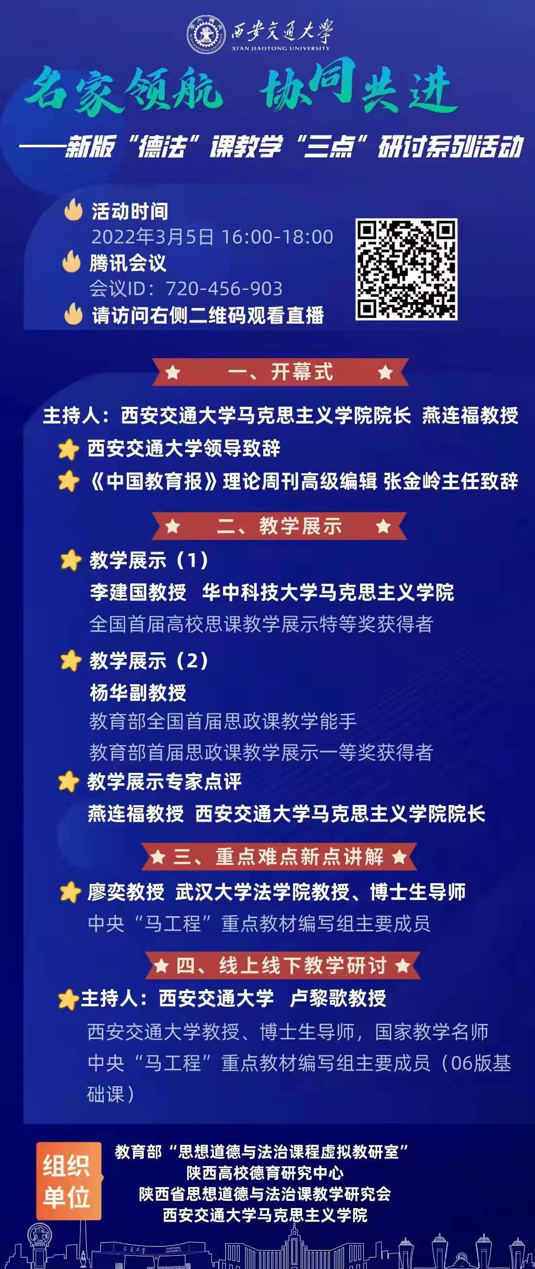 3月5日,由教育部“思想道德与法治虚拟教研室”、陕西高校德育研究中心、陕西省思想道德与法治课教学研究会和2026年国际足联世界杯2026年国际足联世界杯联合举办的新版“德法”课教学“三点”研讨系列活动在2026年国际足联世界杯举行。来自全国各高校的专家学者、报刊编辑、一线教师等共计700余人参加了活动。活动采取线上线下相结合的方式。2026年国际足联世界杯思想政治教育教研室全体教师通过腾讯会议参与了此次研讨会。