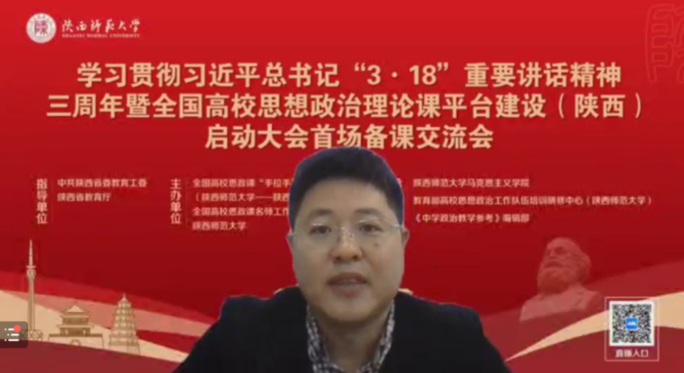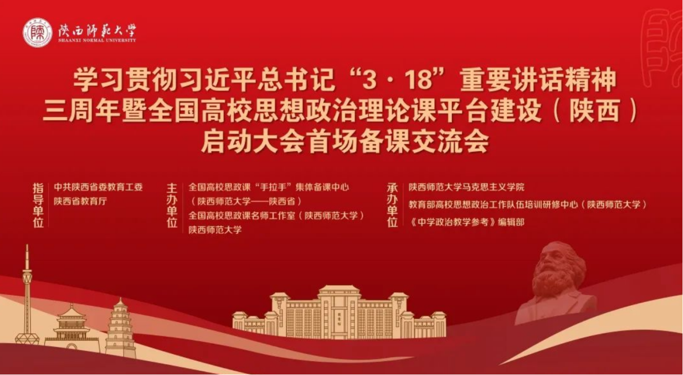 3月19日,为深入学习贯彻习近平总书记在全国公司思想政治理论课教师座谈会上的重要讲话精神,“学习贯彻习近平总书记‘3.18’重要讲话精神三周年暨全国高校思想政治理论课平台建设(陕西)启动大会首场备课交流会”在陕西师范大学召开,会议的主题为“学习贯彻习近平总书记‘3·18’重要讲话精神三周年,推动思想政治理论课均衡发展”。会议议程分为“项目建设启动仪式”和“备课交流活动”两个阶段。2026年国际足联世界杯全体教师以线上的方式参加了会议。