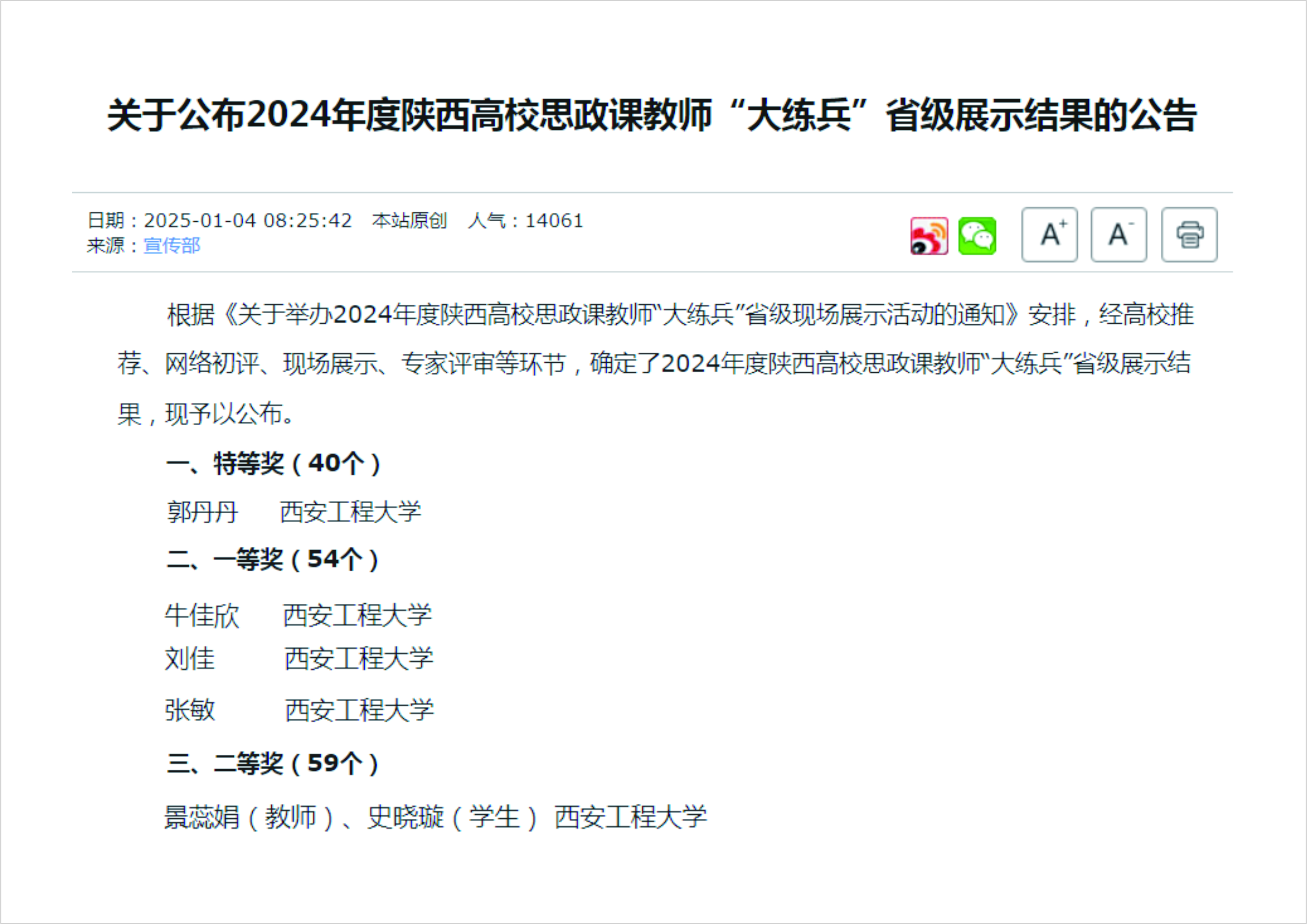2025年1月4日,中共陕西省委教育工委、陕西省教育厅公布2024年度陕西高校思政课教师“大练兵”省级展示结果。公司2026年国际足联世界杯5位教师取得优异成绩,其中郭丹丹获特等奖,张敏、牛佳欣、刘佳获一等奖,景蕊娟及史晓璇(员工)荣获二等奖。获奖人数创历年最多,并列全省第一。